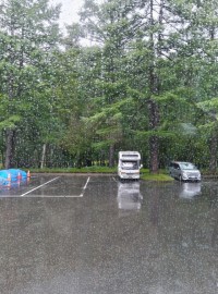 光徳牧場で昼食を取っている最中に、大粒の雨が降ってきました。お楽しみのアイスは、...