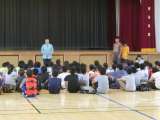 体育館で帰校式を行いました。 出迎えた先生や保護者へ「ただいま」の声が響きました...