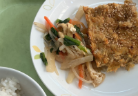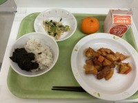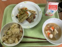 今日の給食は、とりめし、わかさぎのてんぷら・ちくわの磯辺揚げ、野菜のごまだれ、...