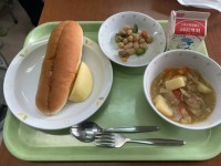 今日の給食は、コッペパン(いちごジャム)、カレーシチュー、ビーンズサラダ、りん...