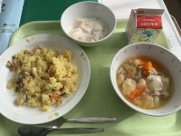 今日の給食は、パエリア、田舎風スープ、フルーツヨーグルトでした。パエリアはエビ...