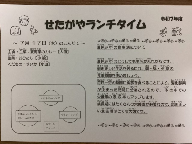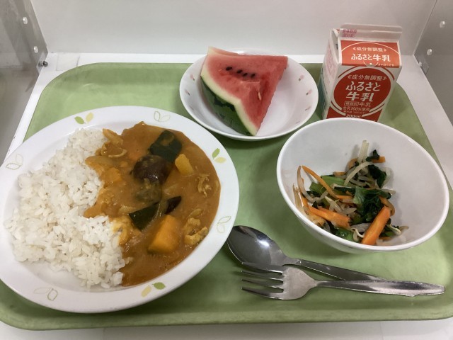 1学期最後の給食の献立のメニューは夏野菜のカレー、おひたし、すいかでした。夏野菜のカレーはナスやカボチャなどの旬の野菜を使用していてとても美味しくいただくことができました。