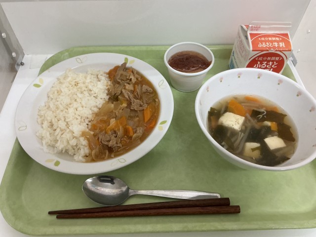 今日の給食はスタミナ丼、豆腐とわかめのスープ、ミルクゼリーでした。豚肉の香ばしい香りに、食欲がぐんぐん湧いてきます。にんじんの甘みや、たけのこのシャキシャキした食感も楽しくいただきました。