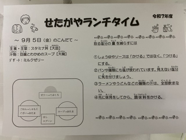 スタミナ丼には、豚肉・にんじん・たけのこなど、栄養たっぷりの食材が使われています。豚肉は、体を動かすエネルギー源となる「ビタミンB1」が豊富で、疲れにくい体づくりに役立ちます。にんじんは「βカロテン」が含まれており、目や肌の健康を守る働きがあります。たけのこは食物繊維が豊富で、腸の働きを助けてくれます。豆腐とわかめのスープは、植物性たんぱく質とミネラルをバランスよく摂れる一品。カルシウムを含むミルクゼリーは、成長期の骨づくりにもぴったりです。