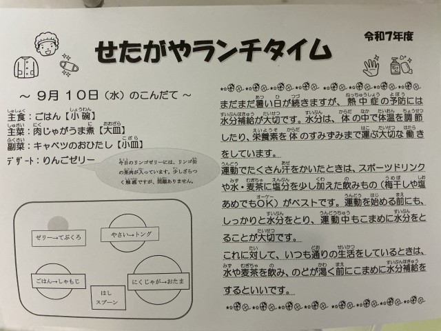 今日の給食はごはん、肉じゃがのうま煮、キャベツのおひたし、りんごゼリーでした。給食の時間になると「肉じゃがだー!」と歓声が上がり、みんな笑顔で配膳をしていました。今日も蒸し暑い日でしたが、「ゼリーが冷たくて気持ちいい!」と嬉しそうに話してくれました。