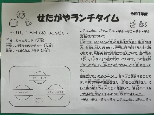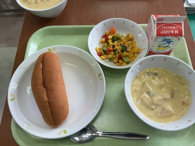 今日の給食はジャムサンド、かぼちゃのシチュー、トロピカルサラダでした。かぼちゃを使ったシチューは「甘くておいしい!」と笑顔で食べていました。ジャムサンドのやさしい甘さや、トロピカルサラダの彩りも相まって、教室には楽しそうな会話が広がり、食事の時間が一層にぎやかになっていました。