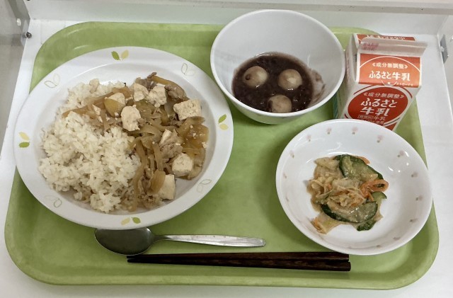 今日の給食は豚丼、野菜のごまみそかけ、そして、白玉ぜんざいです。