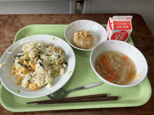 今日の給食は卵とハムのチャーハン、豆腐入りしゅうまい、白菜の中華スープでした。豆腐入りしゅうまいが特に人気で生地がもちもちで中身の味がしっかりしていて美味しくいただくことができました。