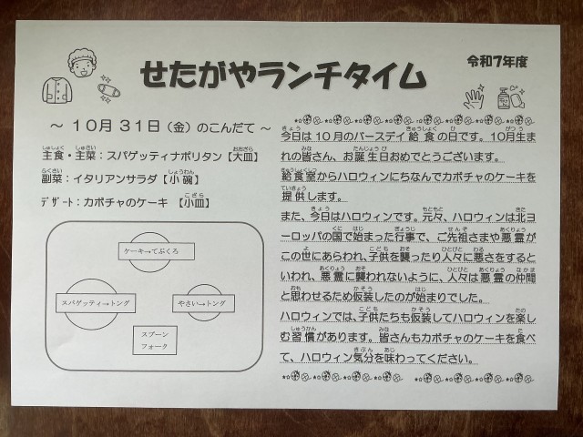 今日の給食は、スパゲッティナポリタン、イタリアンサラダ、カボチャのケーキでした。ハロウィン気分を楽しみながら、ナポリタンを頬張り、カボチャのケーキに笑顔が広がる様子が見られました。