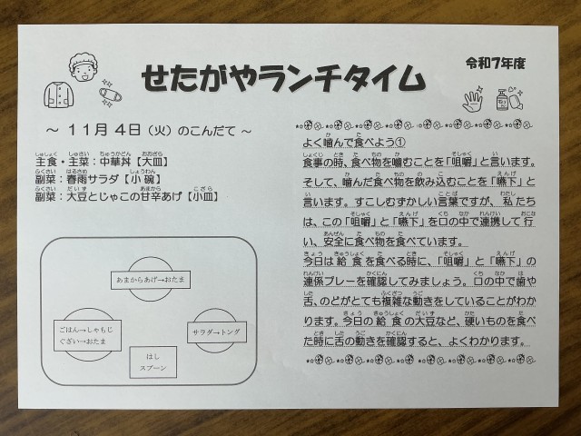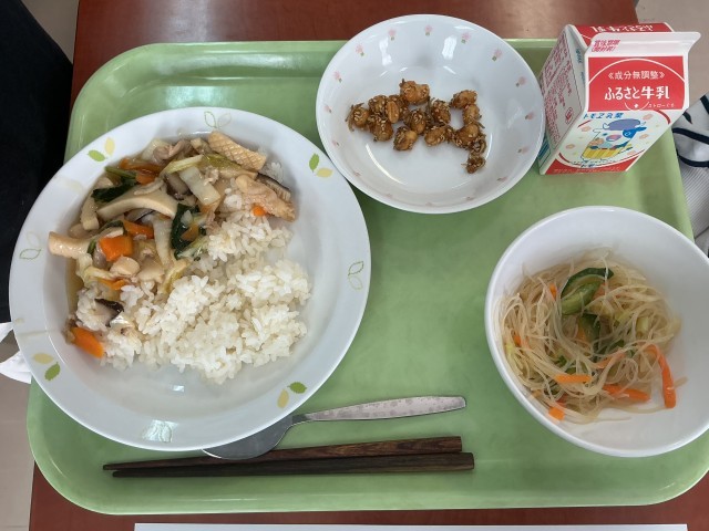 今日の給食は、中華丼、春雨サラダ、大豆とじゃこの甘辛あげでした。スプーンを手にした子どもたちが「具がたくさんでとろとろのあんがおいしい!」とご飯と具を上手にすくって、口いっぱいに頬張っていました。今日の大豆とじゃこは栄養士さんがよくかむこと学べるように考えてくれたメニューです。「かむ」ことを意識して食べられたかな。