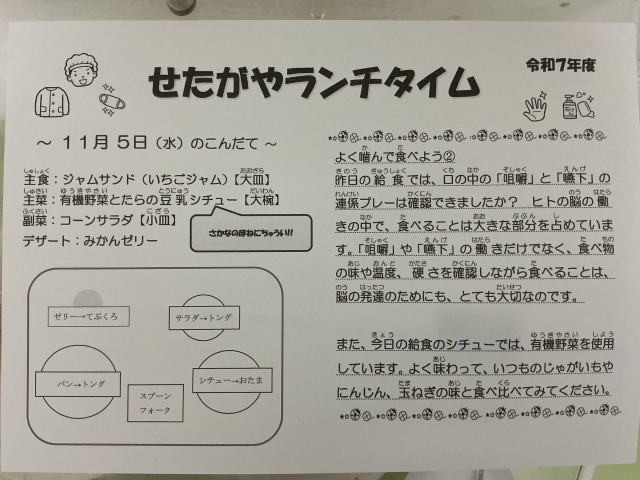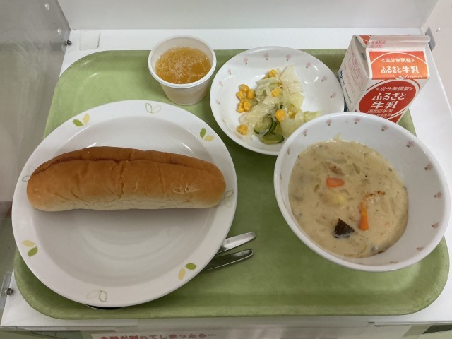 今日の給食は、ジャムサンド(いちごジャム)有機野菜とたらの豆乳シチュー、コーンサラダ、みかんゼリーです。豆乳のやさしい味わいに、にんじんや玉ねぎの甘みが広がりました。ジャムサンドの甘さとシチューのまろやかさに、「どっちも好き!」という声も。よく噛んで味わうことで、野菜のうまみをしっかり感じられました。