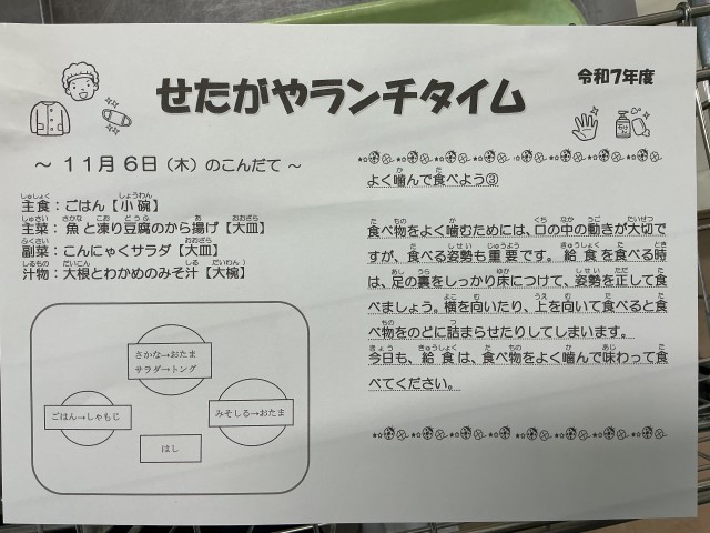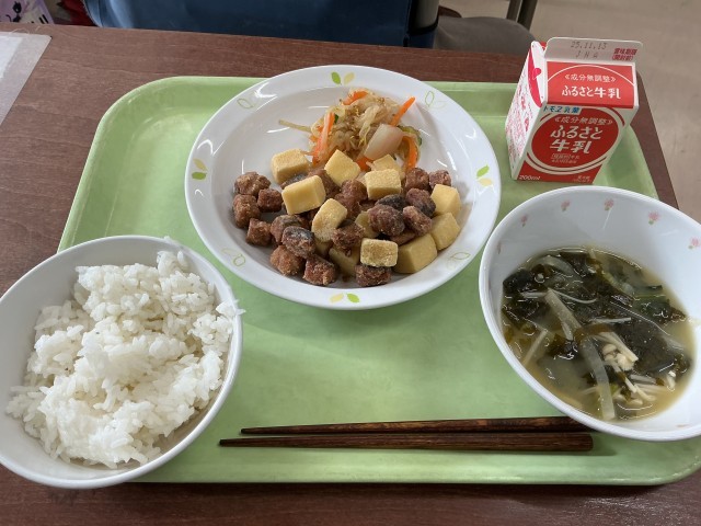 今日の給食はごはん、魚と凍り豆腐のから揚げ、こんにゃくサラダ、大根とわかめのみそ汁でした。1年生は凍り豆腐は初めて食べた子が多かったようです。なかなかご家庭のメニューになることが少なくなったのかもしれませんが、高野豆腐と言われ栄養価の高い日本伝統のスーパーフードです。こんにゃくサラダでは「ぷるぷるしている!」と食感を楽しむ声が聞こえてきました。