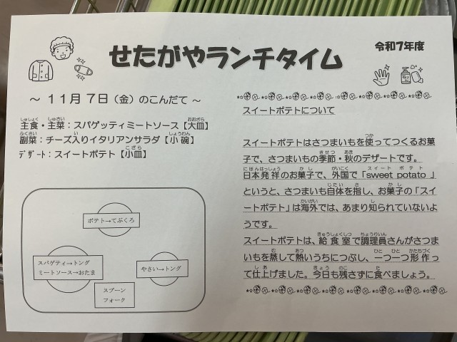今日の給食はスパゲッティミートソース、チーズ入りイタリアンサラダ、スイートポテトでした。サラダの中のチーズがアクセントになっていて美味しく食べることができました。チーズとスパゲッティの相性がよくスパゲッティに混ぜて食べる様子も見られました。