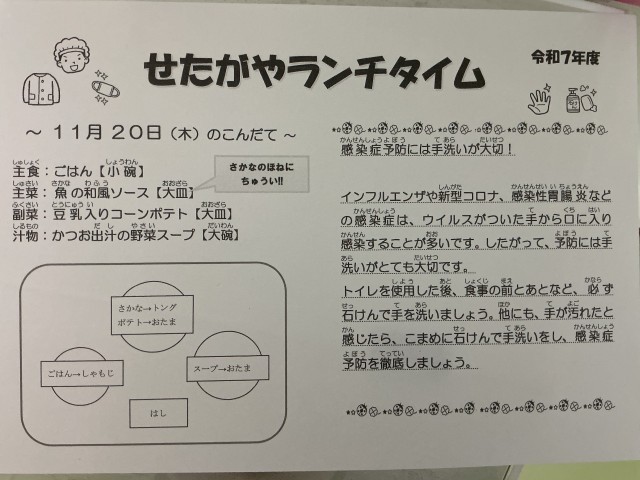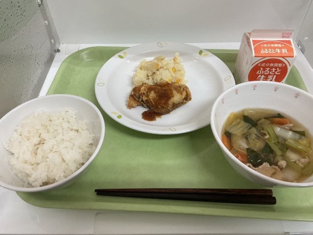 今日の給食は、ごはん、魚の和風ソース、豆乳入りのコーンポテト、かつお出汁の野菜スープでした。