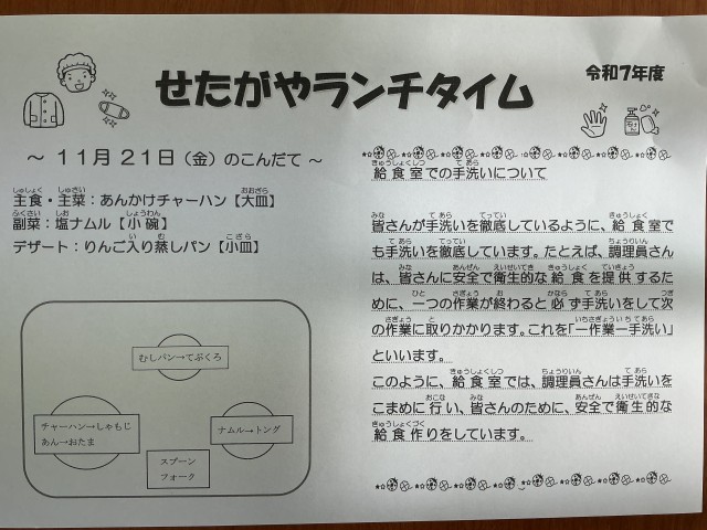 今日の給食はあんかけチャーハン、塩ナムル、りんご入り蒸しパンでした。あんかけチャーハンは、チャーハンにとろみのあるあんをかけた中華風の一品で、冷めにくく最後までおいしく食べられる工夫がされています。児童に感想を聞くとあんかけチャーハンに入っている筍やエビの食感が良くて美味しいと話してくれました。