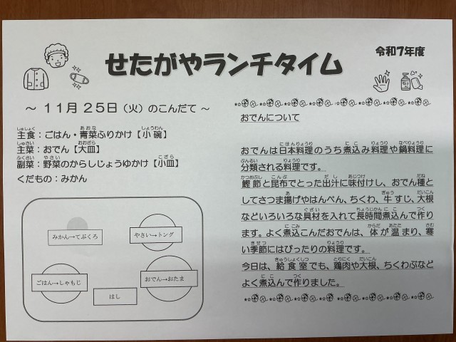 今日の給食は、ごはん、青菜のふりかけ、おでん、野菜のからしじょうゆかけ、みかんでした。6年生の教室では、おでんの具材についてどの具材が好きかという話題で盛り上がっていました。今日は「ちくわぶ」「はんぺん」「餅巾着」が人気の具材でした。