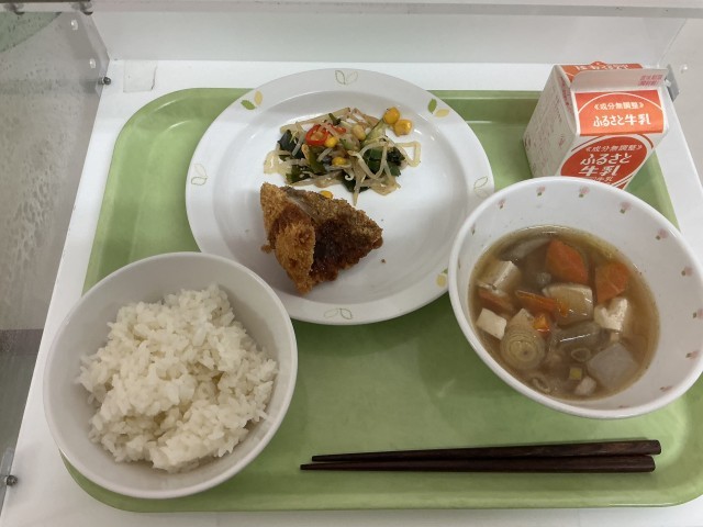 今日の給食は、有機米ごはん、魚のフライ、もやしとわかめのサラダ、けんちん汁でした。魚のフライは衣がサクサクで、かむと香ばしさが広がり、とてもおいしかったです。サラダはシャキシャキのもやしとわかめの食感が楽しく、さっぱりとした味わいでフライとの相性も抜群でした。
