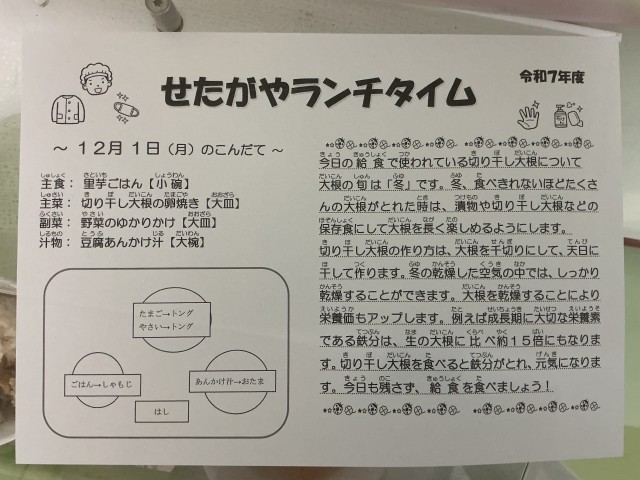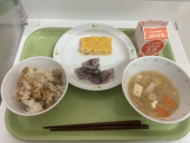 今日の給食は里芋ごはん、切り干し大根の卵焼き、野菜のゆかりかけ、豆腐のあんかけ汁でした。実際に給食を見て、里芋ごはんや豆腐のあんかけ汁に具がたくさん入っているから美味しそうと児童が話をしていました。