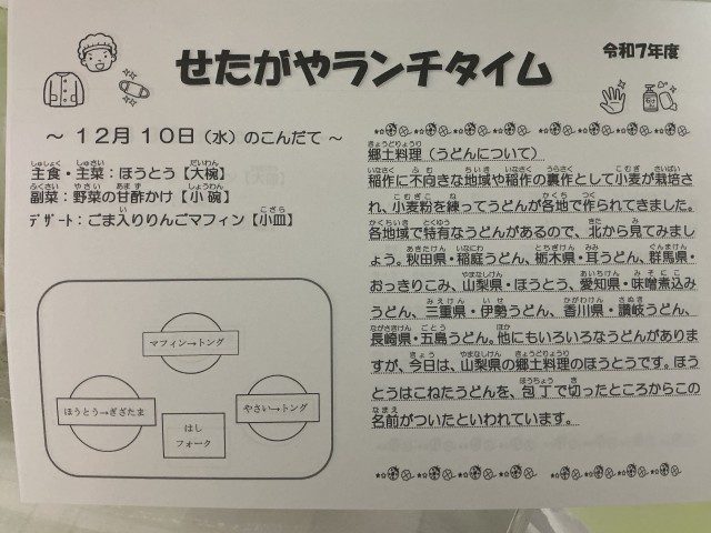 今日の給食は、ほうとう、野菜の甘酢かけ、ごま入りりんごマフィンでした。ほうとうは山梨県を代表する郷土料理で、幅広の平たい麺とたっぷりの野菜を味噌仕立ての汁で煮込むのが特徴です。山梨県は米の栽培に適さない土地が多く、小麦が主食として使われてきました。そのため、小麦粉を練って麺にし、味噌で煮込む料理が生まれたのです。ほうとうの麺はうどんよりも太くて柔らかく、煮込むことで汁をよく吸い、もちもちとした食感になります。具材にはかぼちゃ、にんじん、ねぎ、しいたけ、白菜など、季節の野菜がたっぷり使われます。特にかぼちゃはほうとうの象徴的な食材で、甘みが加わることで味噌の風味とよく合います。