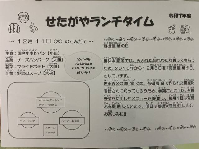今日の給食は国産小麦粉パン、チーズハンバーグ、フライドポテト、野菜のスープでした。今日のパンは国産小麦粉で作られています。日本で消費される小麦のうち、約85%以上は輸入品で、国産小麦はわずか15%程度。給食で国産小麦を味わえるのは、ちょっと特別なことなんです。国産小麦は香りがよく、もちもちした食感が特徴です。