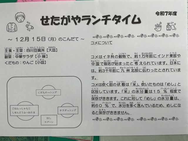 今日の給食は四川豆腐丼、中華サラダ、リンゴでした。四川豆腐丼は6年間の給食で一番好きだと!と喜んで食べている児童もいました。今日は校内でも食缶が空になっているクラスが多く、栄養士さんも嬉しそうでした。
