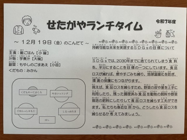 今日の給食は、鮭ごはん、芋煮汁、もやしのごまあえ、みかんでした。今日は寒い一日でした。暖かい芋煮汁で元気に過ごしてほしいです。