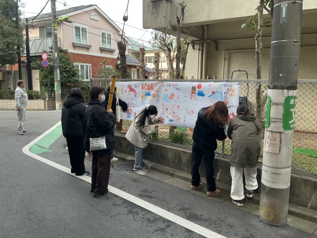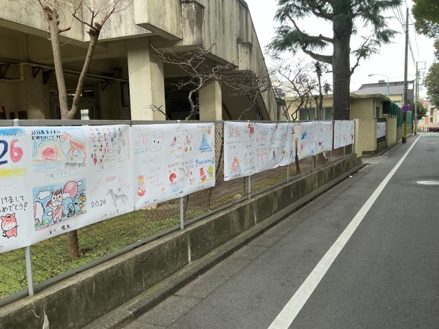 1月7日(水)に世田小地域ネット「いぶき」の方々とPTAのみなさん、教職員で協力をして子どもたちが書いた年賀はがきを学校周囲のフェンスに提示しました。子どもたちの書いた年賀は一人ひとり違った馬のイラストや新年をイメージさせる絵があり並び見応えがあります。学校公開期間などで来校される際にご覧ください。掲示は1月25日(日)に撤去の予定です。