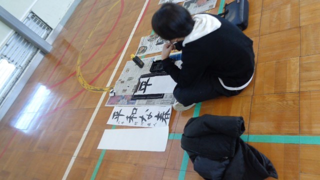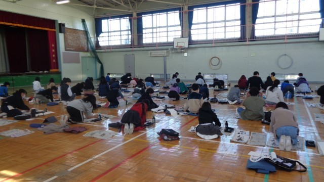 1月8日に6年生は体育館で席書会を行いました。今年が平和な年でありますように願います。この日はとても冷え込みました。主事さんが暖房の用意をしてくださったおかげで、快適に取り組むことができました。感謝です。