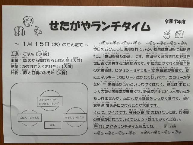 今日の給食は、ごはん、魚のから揚げおろしぽん酢、かまぼこ入りおひたし、卵と豆腐のみそ汁でした。今日のおひたしでは世田谷育ちの野菜を使用してます。世田谷で育ちの野菜は次のようなものがあります。