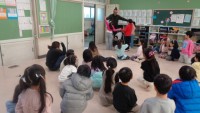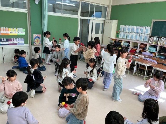 まず色々な技の紹介をしていただき、その後、一人一つけん玉をもって、球を乗せて歩く、ジャンプ、回るなどしながら、けん玉に親しみました。大皿にも挑戦し、うまくのった子も、そうでない子も、みんな楽しんで活動しました。最後は「もっとやりたい」「また来てほしい」と感想を述べていました。