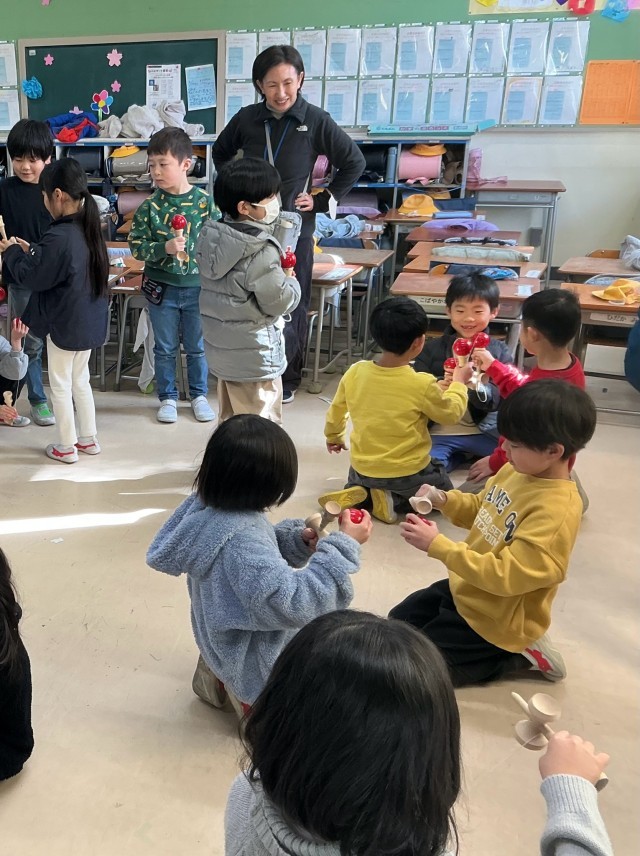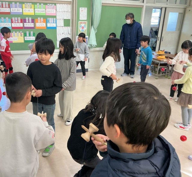 1月26日(月)本校保護者でもある菊池諒平さんをお招きしてけん玉を教えていただきました。