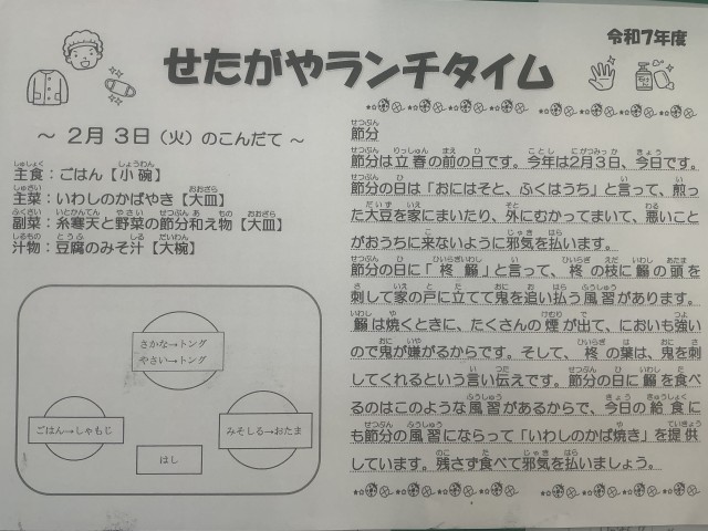 今日の給食は、ごはん、いわしのかばやき、糸寒天と野菜の節分和え物、豆腐のみそ汁でした。節分には「柊いわし」という風習があります。柊の葉は鬼が嫌うと言われ、いわしの匂いと合わせて邪気を払うとされてきました。今日の給食の「いわしのかばやき」も、この節分の風習にちなんだ料理です。