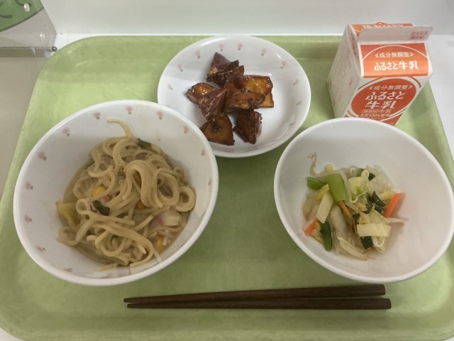 今日の給食は味噌ラーメン、中華サラダ、大学いもでした。