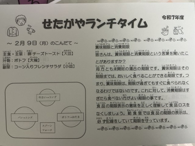 今日の給食は、卵チーズトースト、ポトフ、コーン入りフレンチサラダでした。今日のせたがやランチタイムには「賞味期限」と「消費期限」のお話がありました。どちらも似ていますが、意味は少し違います。
