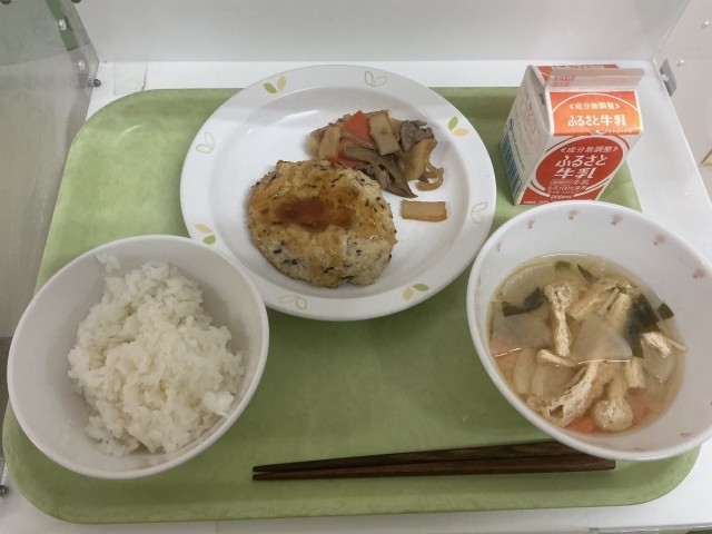 今日の給食はごはん、豆腐入りハンバーグ、じゃがいものきんぴら、大根のみそ汁でした。