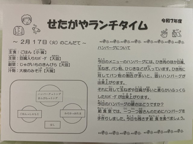 主菜のハンバーグには、ひき肉のほかに豆腐・玉ねぎ・パン粉が使われています。豆腐や玉ねぎが入ることで、やわらかく、ふっくらとした食感に仕上がります。給食室では、子どもたちが食べやすいように、一つ一つ心をこめて手作りしています。今日も残さず、おいしくいただきました。