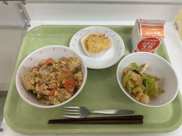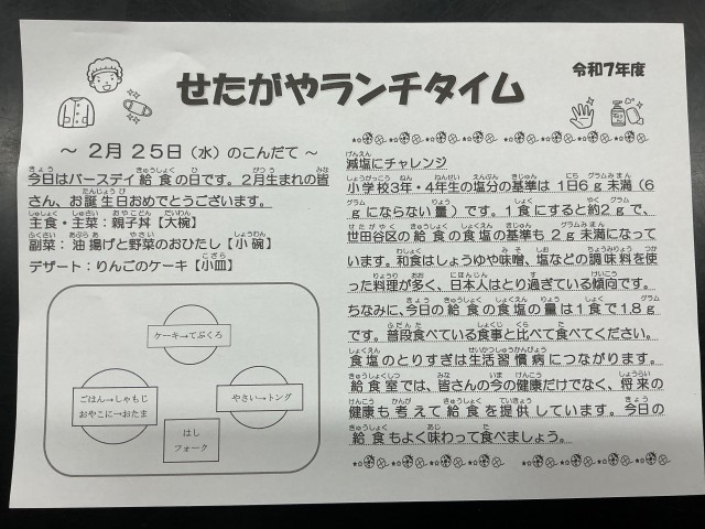 今日の給食は親子丼、油揚げと野菜のおひたし、りんごのケーキでした。デザートのりんごのケーキで、教室も少し特別な雰囲気になりました。2月生まれのみなさん、お誕生日おめでとうございます!