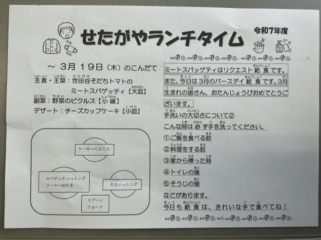 今日の給食は、世田谷そだちトマトのミートスパゲッティ、野菜のピクルス、チーズカップケーキでした。ミートスパゲッティはリクエスト給食です。また、今日は3月のバースディ給食でした。お誕生日の皆さんおめでとうございます。
