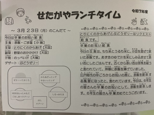 6年生の皆さんご卒業おめでとうございます。そして、今日は令和7年度の給食最後の日です。1年間給食を食べてくれてありがとうございました。