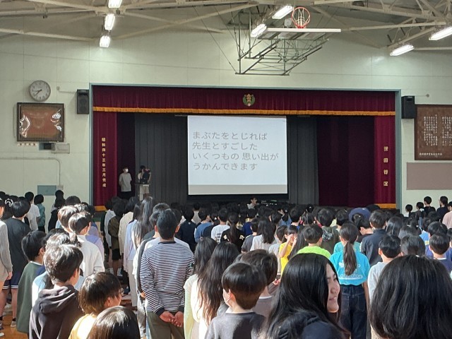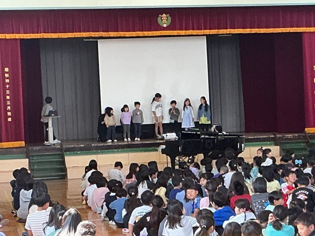 今回は、校歌と「離任式のうた」を全校で歌うことを目的に、音楽委員会の進行で集会が進められました。校歌では、学年ごとに歌う部分があり、どの学年も気持ちを込めて歌う姿が印象的でした。また、「離任式のうた」では、これまでの出来事を思い浮かべながら、全校で心を一つにして歌うことができました。