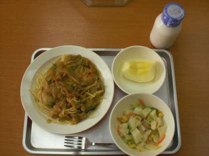 11月29日(木)、今日の献立は、スパゲッティカレーソース、ポテト入りフレンチサラダ、くだもの、牛乳です。