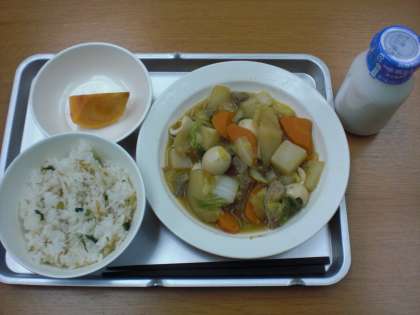 12月3日(月)、今日の献立は、青菜とじゃこのごはん、豚肉と大根のうま煮、くだもの、牛乳です。