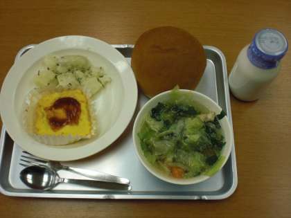 12月4日(火)、今日の献立は、ミルクパン、チーズ入り卵焼き、パセリポテト、野菜スープ、牛乳です。