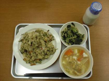 12月17日(月)、今日の献立は、豚肉とごぼうのごはん、みそ汁、じゃこサラダ、牛乳です。