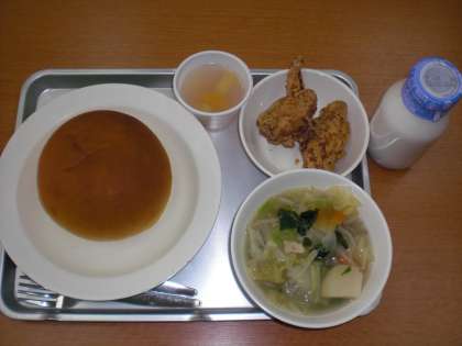 12月21日(金)、今日の献立は、パンプキンパイ、フライドチキン、ベーコンと野菜のスープ、フルーツゼリー、牛乳です。