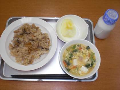 2月18日(月)、今日の献立は、中華おこわ、中華風コーンスープ、くだもの、牛乳です。