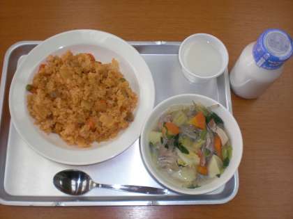 2月20日(水)、今日の献立は、チキンライス、ベーコンと野菜のスープ、ホワイトゼリー、牛乳です。
