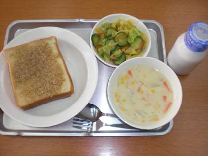 2月21日(木)、今日の献立は、セサミトースト、コーンシチュー、野菜のイタリアンドレッシングかけ、牛乳です。