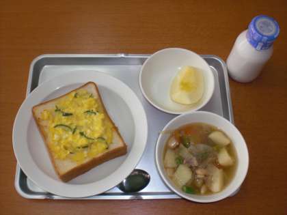 2月26日(火)、今日の献立は、たまごトースト、白いんげんの田舎風スープ、くだもの、牛乳です。