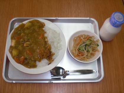3月7日(木)、今日の献立は、カレーライス、福神漬、こんにゃくサラダ、牛乳です。